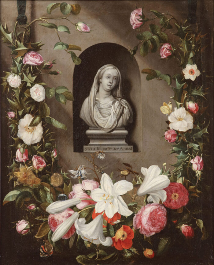 Bloemencartouche rond een buste van de Maagd Maria in een halfronde stenen nis met het devies ‘Sicut.lilium.inter.spinas’